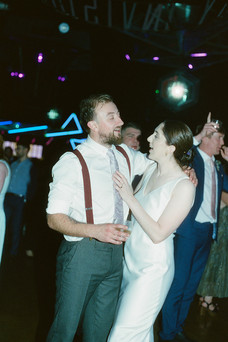 After the ceremony, they headed to one of the most unusual (and brilliant) venues I’ve ever photographed: The Invisible Wind Factory. Normally a rollerskating disco, this space was transformed into a psychedelically colourful, joy-filled celebration that felt completely personal to Hannah & Dan.